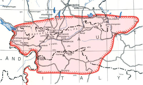 Above: A 1945 U.S. Army map showing the possible extent of the 'National Redoubt' the mountainous area from which the SS and the Werwolves would mount their guerrilla war.